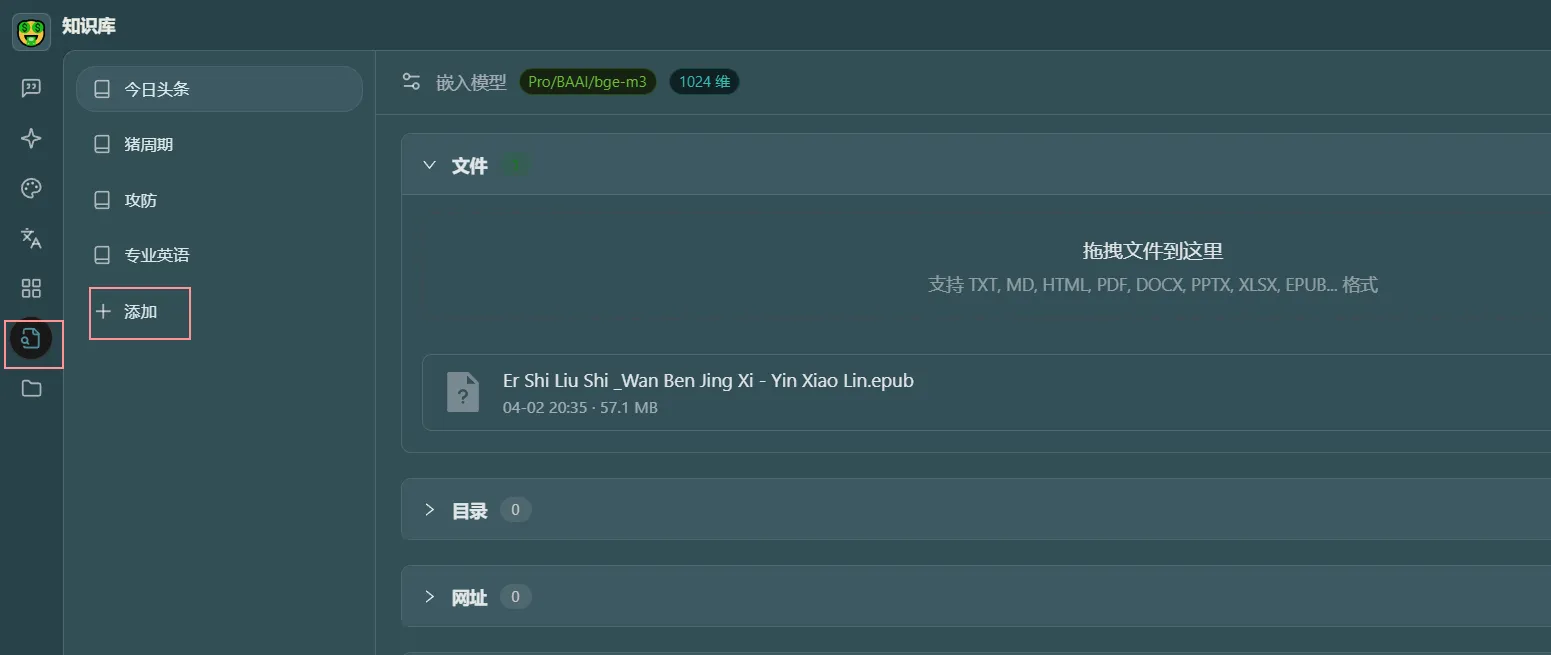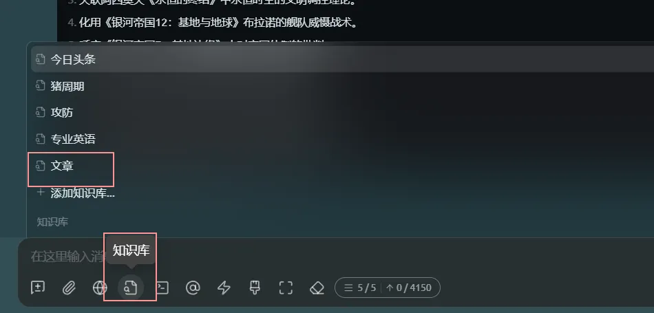 回到聊天,在聊天栏下面添加知识库,选择添加刚刚创建好的知识库——文章。
