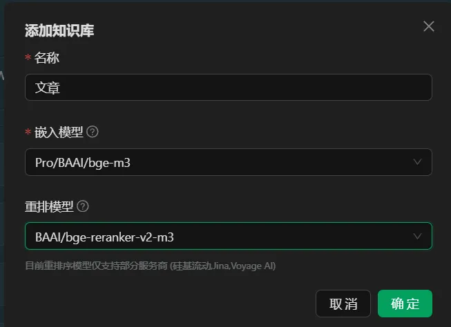 随便起个名称,然后设置一下嵌入模型以及重排模型,注意 Pro 这个嵌入模型是付费的,并且使用给知识库喂材料会消耗大量的 token。