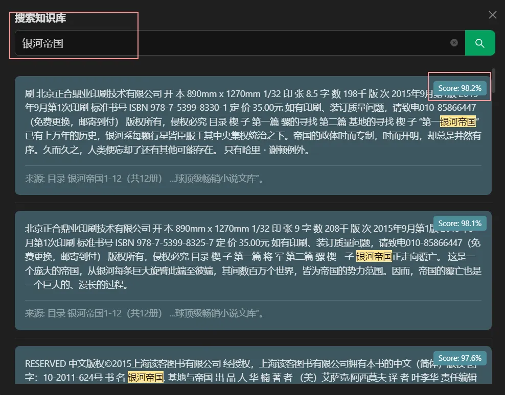 这时候我们可以搜索一下知识库,看看内容,右上角有得分情况。注意搜索也是调用了大模型的,所以如果不是本地部署的话需要联网才能使用。