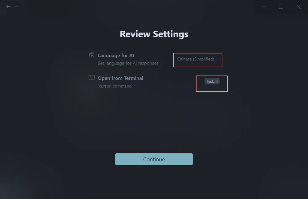 语言选择简体中文,然后把指令安装一下,可以通过在 powershell 中输入 cursor 直接打开 cursor。
