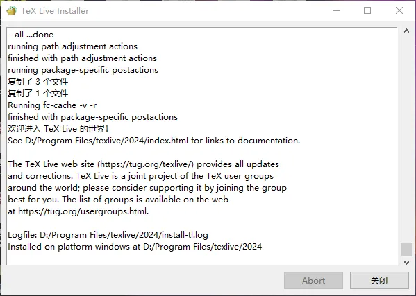 接着就是非常漫长的等待时间,直到出现欢迎进入 Tex Live 世界。就安装完成了。