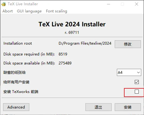这里把安装 TeXworks 前端给关闭,不需要,之后使用 vscode 进行 latex 写作。