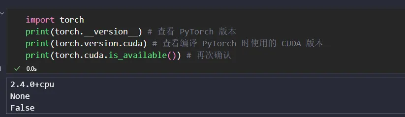 以及是否使用了 cuda,可以看到 torch 的版本后面有个 +cpu, 而 cuda 是否可用返回的是 none 说明没有用到 cuda。
