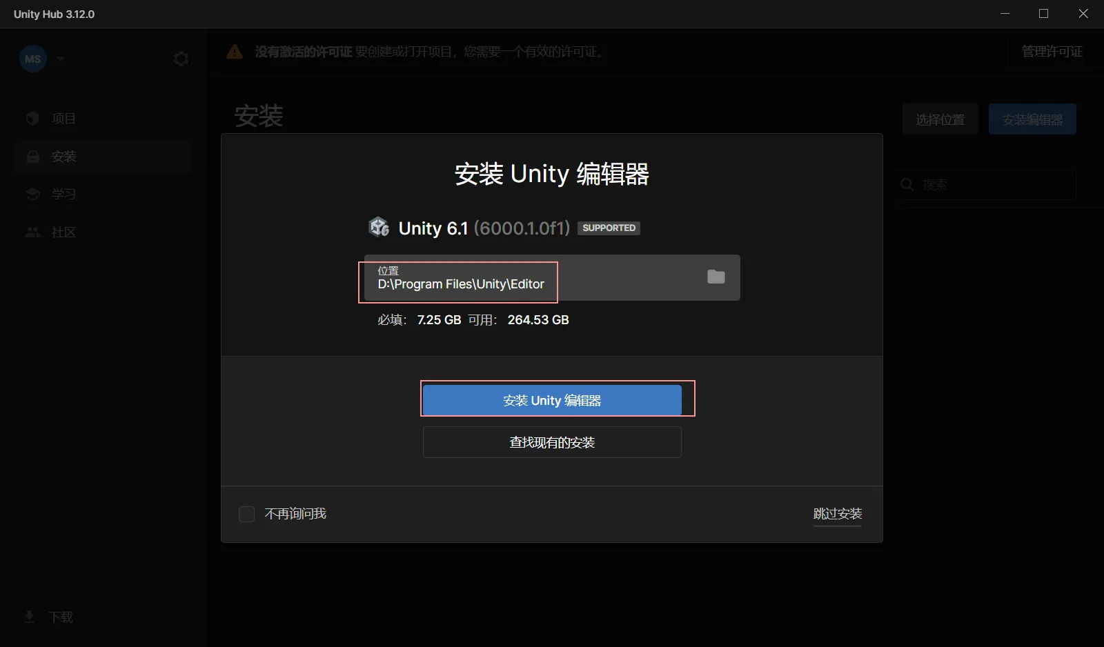 在官网下载 unity,双击 exe 文件安装,注意把安装位置按在 C 盘外。