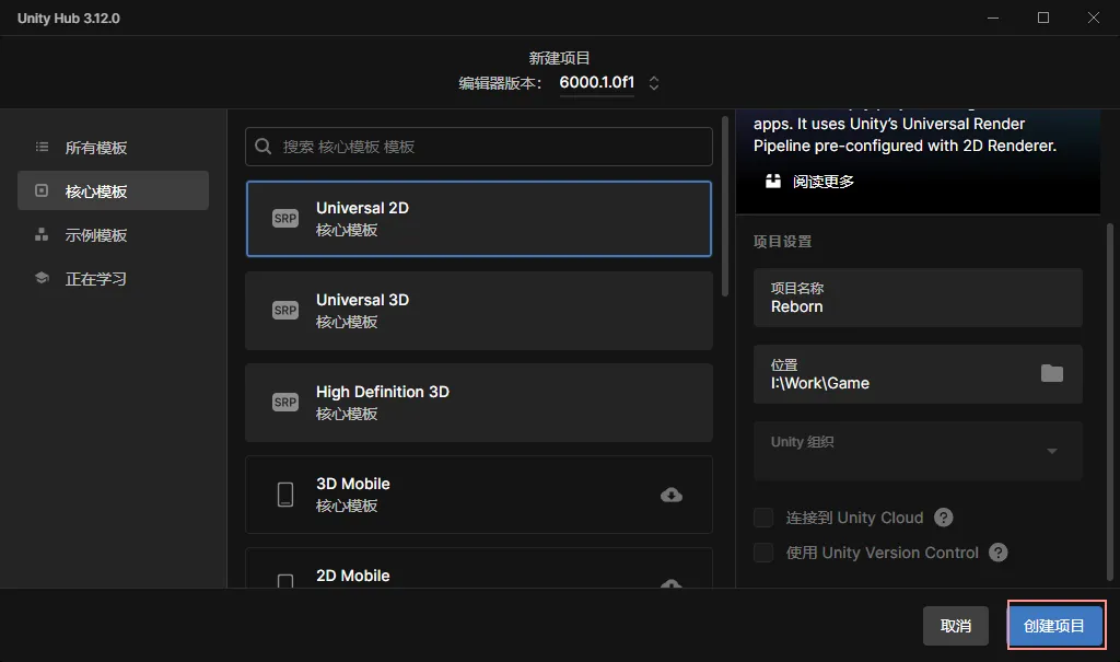 可以在这里就连接到 Unity Cloud,并使用 Unity Version Control。