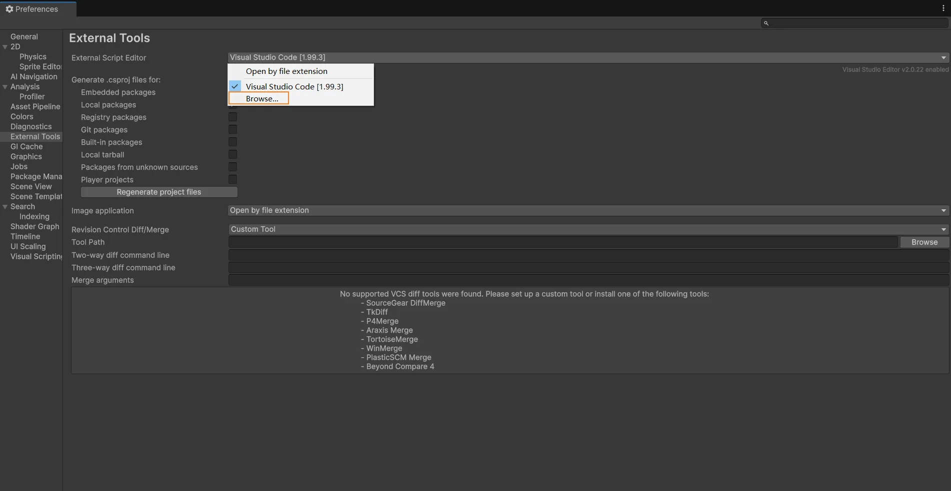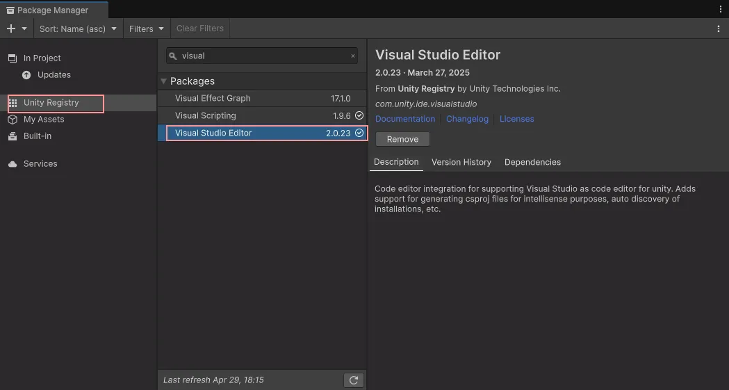 注意是在 unity registry 下面,搜索 visual studio editor,如果没有安装,点击 install。