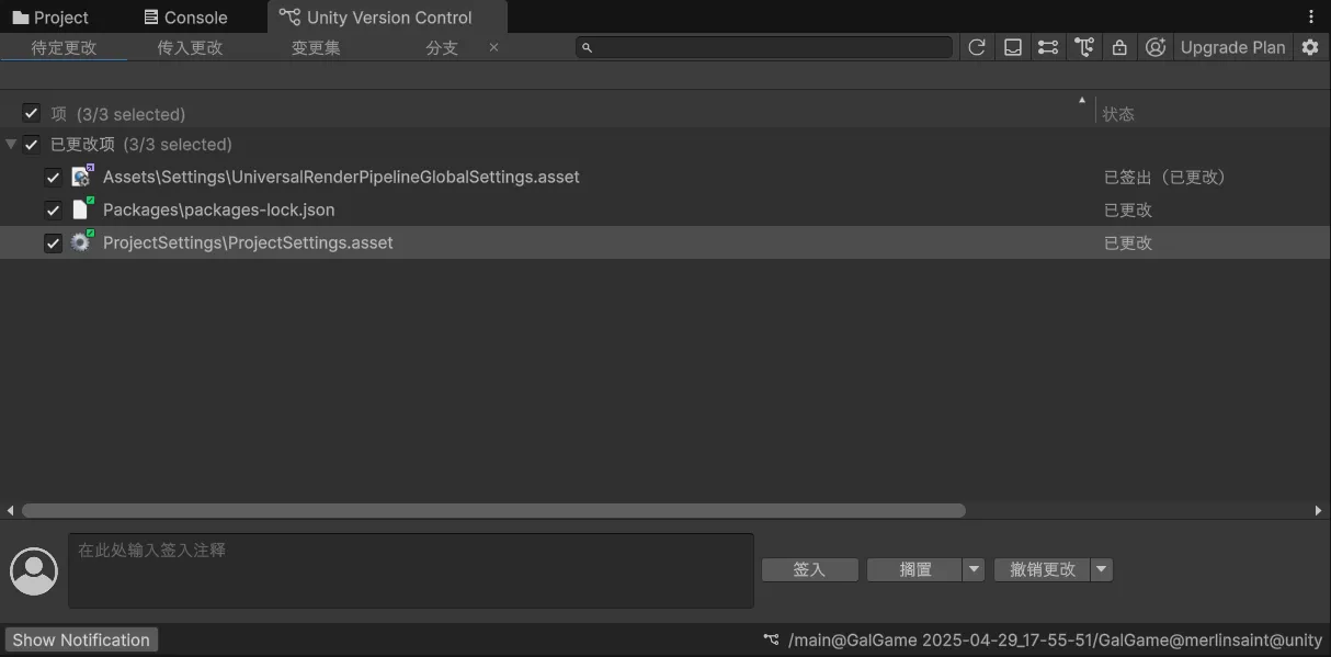接着才能使用 unity version control。