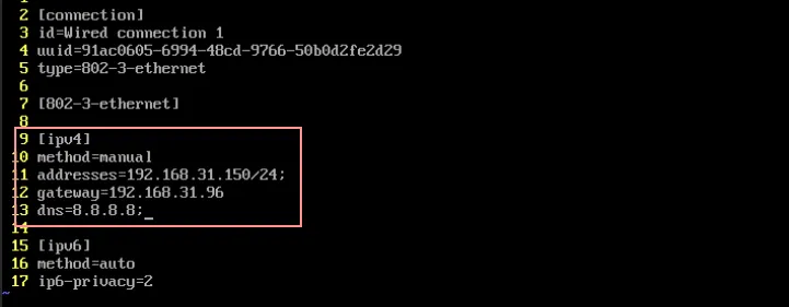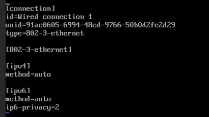 sudo vim "/etc/NetworkManager/system-connections/Wired connection 1"注意这里必须要用管理员权限,没有管理员权限连使用 cat 去查看一下都不可以。