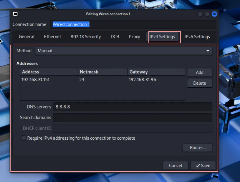 把 method 改为 manual,点击下面右侧的Add按钮,输入地址,掩码以及网关,填写 dns,然后点击 save 保存。