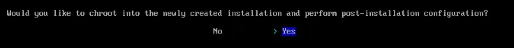 安装完后,让你用 chroot,选择 yes。如果你不需要配置什么东西,就选择 no 就行,我这里建议选择 no,直接重启一下电脑,有什么需要配置的之后再配就是了。