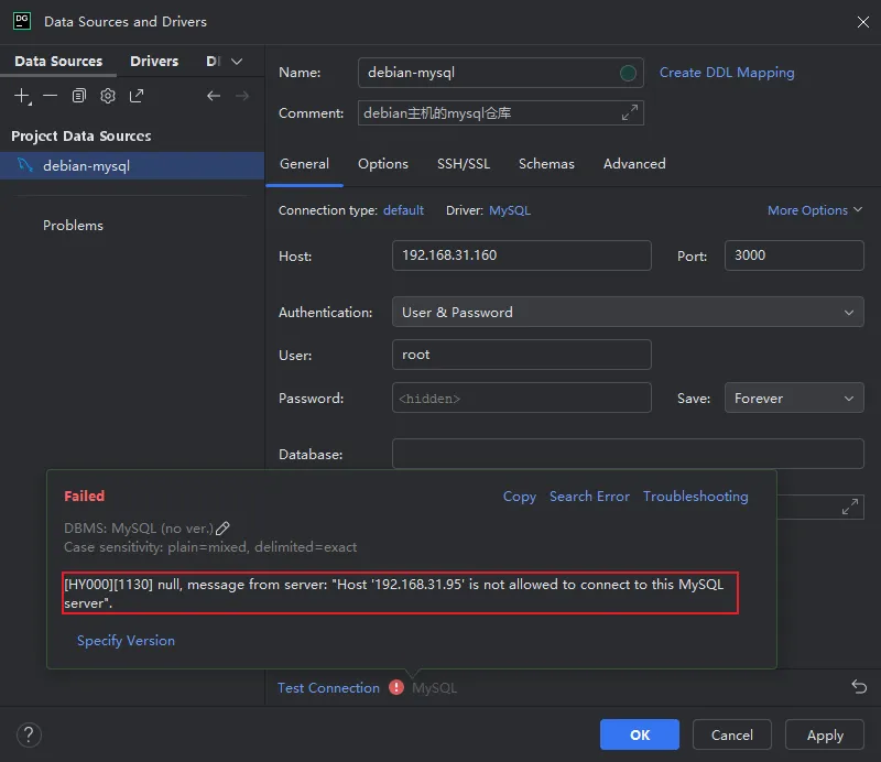 默认的一些 mysql user 后面的 host 也就是 ip 地址都是 localhost,表示只能够通过本地连接。