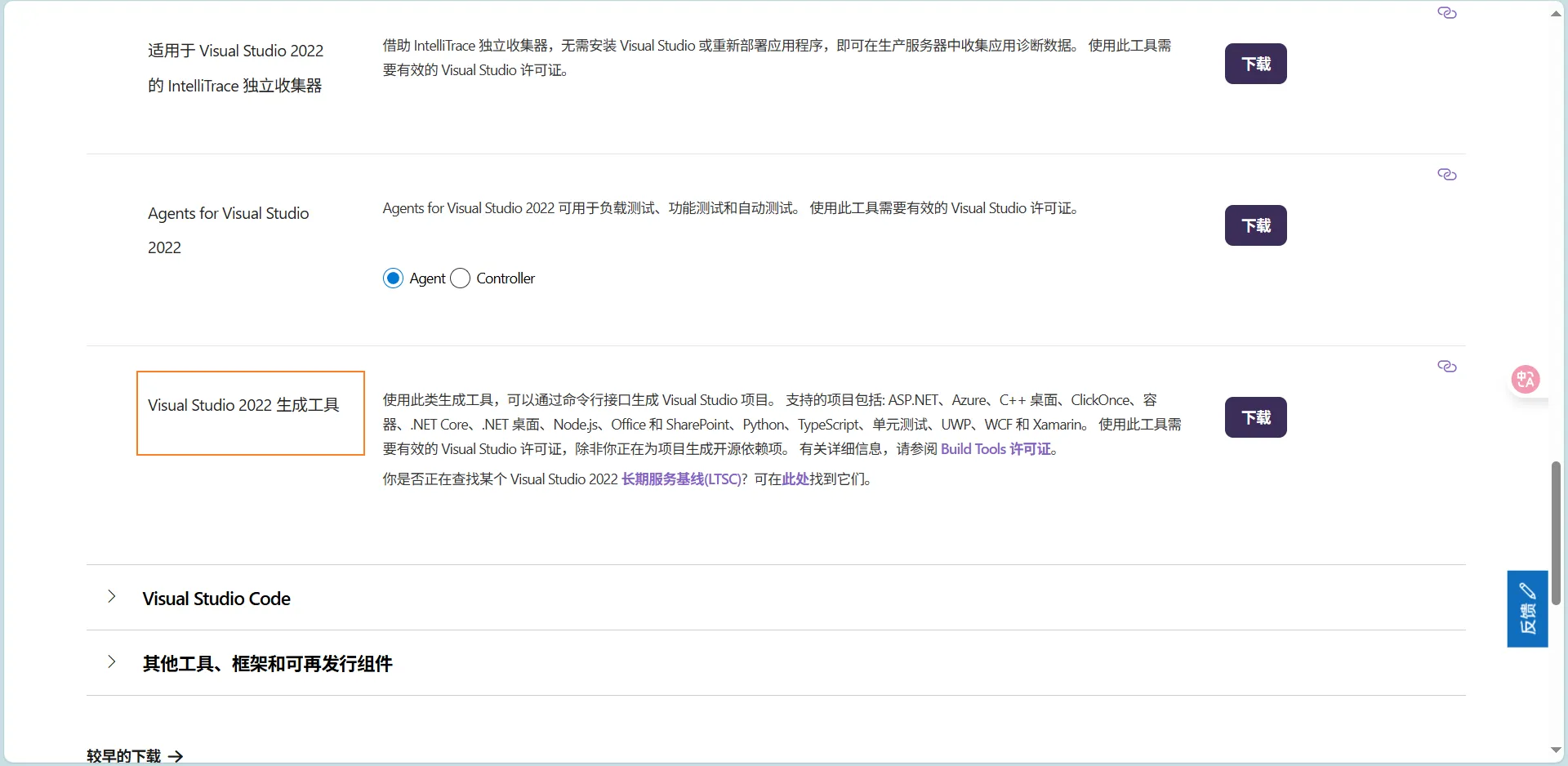 进入上面的连接,然后拉到下面,选择适用于 vs 的工具,然后到最下面,我们要安装的是 vs 生成工具。