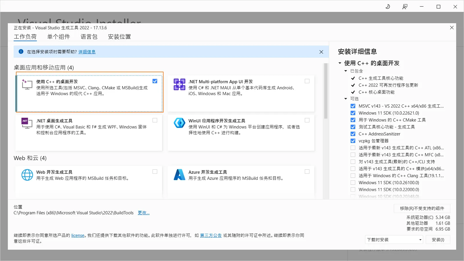在工作负荷中只用选择使用 C++的桌面开发,点击下载时安装。