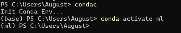 Set-Alias -Name condac -Value Initialize-Conda保存,然后重启 powershell。