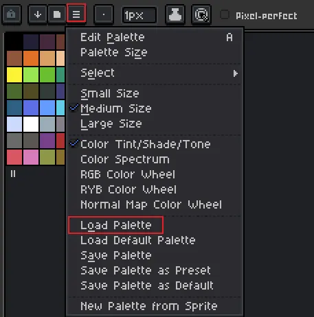 点击调色盘的三个横线,也就是设置。选择 Load Palette。